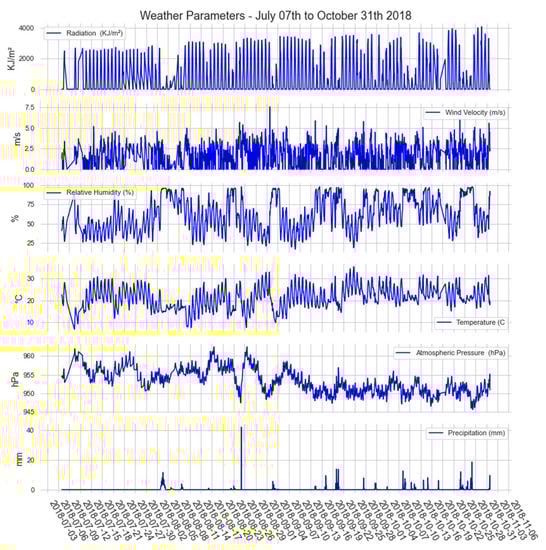 For the period of sensor readings studied in this work, collected through the floating IoT monitoring station, the following parameters were observed: solar radiation had a maximum of 4089 KJ/m2 and a minimum of 0 when it was night; precipitation only occurred for a few days over almost four months of observation of data collections, characterizing this period as a dry period, with a maximum total precipitation of 42 mm; atmospheric pressure oscillated between 963 and 953 hPa; the wind speed had a maximum of 7.6 m/s and a minimum of 0 m/s; the maximum relative humidity was 99% and the minimum was 17%. Figure 10 shows the data from the Main Climatological Station of Maringá (ECPM).
