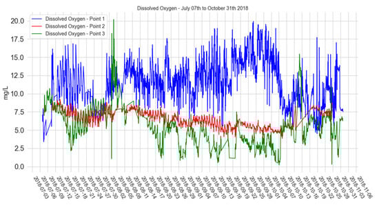 We observed that the dissolved oxygen sensor installed at P1 showed large oscillations during the measurement period. As Sanepar performed the backwashing on the pumps for capture and de-sanding in the water inlet area, these operations were initially attributed to the fluctuations in the measurements. Later, at the end of the measurement period, it was discovered that the oscillations were caused by the sensor itself. We verified that the readings of the DO probe in P1 were always much higher than the expected value, with readings that sometimes exceeded 10 mg/L, where the average water temperature is above 20 °C. This can be justified due to the movement of the sensor in the water. The sudden movement caused by water turbulence due to the installation location in P1 favored readings above expectations. This fact is due to the change in the partial pressure of oxygen [,,] in the galvanic electrode equipment’s membrane, which considerably increased its readings. Therefore, its reading throughout the time series was accentuated, according to Figure 12.