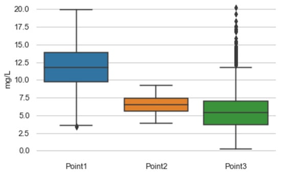 As the main objective of this study was to observe and test the efficiency of the IoT sensor network and not to make an in-depth analysis of the values read by the probes, this sensor was kept for carrying out the measurements. For better visualization and to assist in interpreting the information, we used the boxplot graph for these same values, as shown in Figure 12. The oxygen levels at Point 1 showed higher values, followed by P2 and P3. Point 2 presented minor variations in the level of dissolved oxygen over the period.