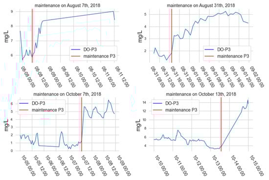 Figure 14 shows significantly increased readings after cleaning the dissolved oxygen probe in P3. In Figure 14, we observe four cleaning procedures. In all procedures, the same fact observed above occurred. With this, we conclude that the values of the dissolved oxygen readings in P3 were low, possibly due to the dirty membrane present in the probe, and there may also be other factors parallel to this, contributing to these low values for OD readings in P3.