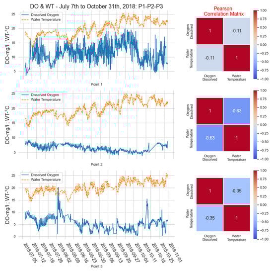 Figure 15 on the right shows a correlation pair from the data, including DO-WT, demonstrating a negative correlation [,,]. The Pearson correlation matrix was calculated among the parameters.