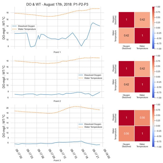 Concerning daily temperature variations, this does not occur, and as shown in Figure 16 obtained from the day of the measurement on August 17th, we observed that an increase in temperature does not imply a decrease in the level of dissolved oxygen in the water. Therefore, variations in the level of oxygen in the water occur for reasons other than temperature variations, such as solar radiation [,,,]. Figure 16 on the right shows a correlation pair from the data, including DO-WT, demonstrating a positive correlation [,,]. The Pearson correlation matrix was calculated among the parameters on a single day: 17 August 2018.