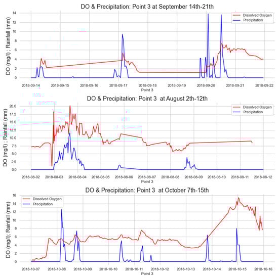Due to its location, we observed that the rain recorded at the Climatological Station of Maringá significantly influenced the dissolved oxygen in the Sarandi Stream (Point 3), as shown in Figure 17.