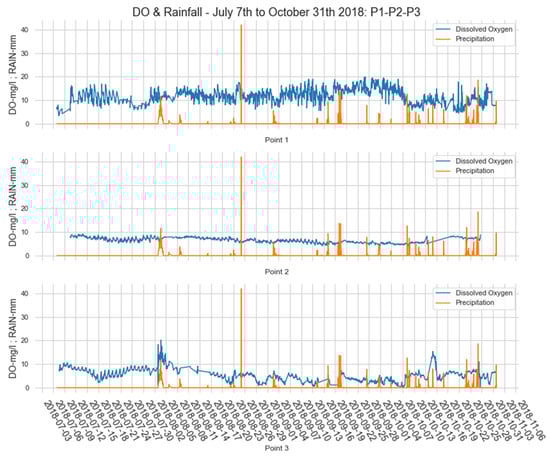 According to Figure 20, we have a daily behavior of probes from points 1–3. We verified that the behavior of the DO variable is in line with the literature [,,,]. Therefore, with the presence of solar radiation, positively correlated readings were observed. This correlation is a behavior observed in the three probes: after the period of solar radiation, the process of decline in the values read in OD begins, probably due to the respiration of the ecosystem and the lack of photosynthesis, a behavior observed until the beginning of solar radiation of the following day.