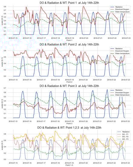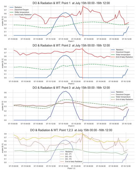 We can see in Figure 19 that the level of dissolved oxygen at Points 1–3 increases with increasing solar radiation and decreases often at night after 21:00.