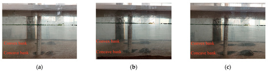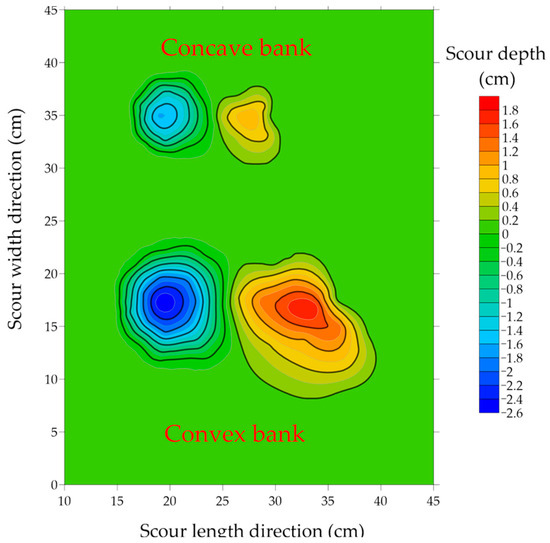 There are some discrepancies in the scour mechanisms at piers near the convex bank compared to those near the concave bank because of the flume’s sinuosity. Sediment particles were eroded and transported by vortexes and exhibited a circular motion in front of piers near the convex bank (hereinafter referred to as the convex bank pier), and only a small number of sediment particles were disturbed at the rear side of the pier due to the blockage of the structure. Meanwhile, the scouring process around the pier near the concave bank (hereinafter referred to as the concave bank pier) underwent a similar scouring process, but the circular motion of the sediment particles was clearly weak compared to that around the convex bank pier. The sediments transported by the flow around both piers were deposited downstream of the piers where the influence of the vortex was not prominent. Once the scouring process around bridge piers was initiated, the depth and area of the scour hole expanded with time. This pattern was also observed for the height and the expanse of the deposition dunes, whose direction followed the sinuosity of the flume. It was observed that the scour holes around the convex bank piers were deeper and wider than those around the concave bank piers, and the deposition dunes behind the convex bank piers were also higher, as shown in Figure 4 and Figure 5.