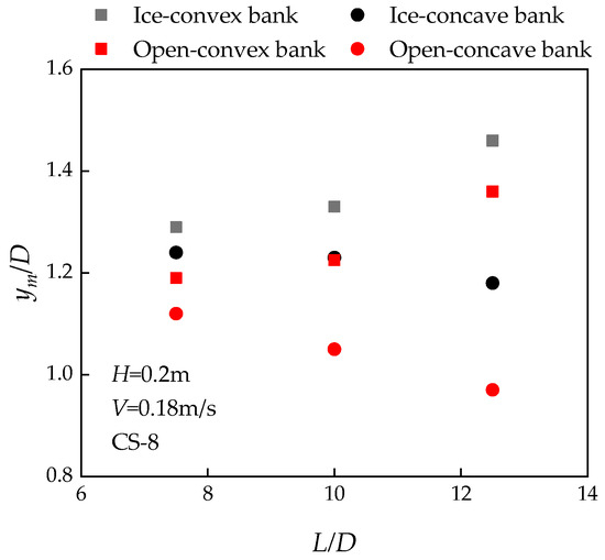 As demonstrated in Figure 7, the velocity gradient in front of the piers under an ice-covered flow condition is larger than that under an open flow condition. One can obtain from Equation (1) that the Reb is larger under an ice-covered condition, and the strength of the horseshoe vortex is also more violent, exacerbating the local scour at the piers. Additionally, greater approaching velocity gradients will be yielded along the convex bank compared to those around the concave bank pier under the same conditions. Therefore, the Reb around the convex bank pier is larger, which could produce stronger horseshoe vortices. As a result, one can see from Figure 8 that the scour depths around the convex bank pier are substantially greater than those around the concave bank pier. The relative local scour depth (calculated as ym/D) under ice-covered conditions is about 10%~20% greater than that under open channel conditions, as shown in Figure 8, similar to the results for a single pier proposed by Ackermann et al. [15].