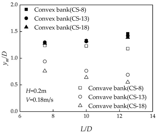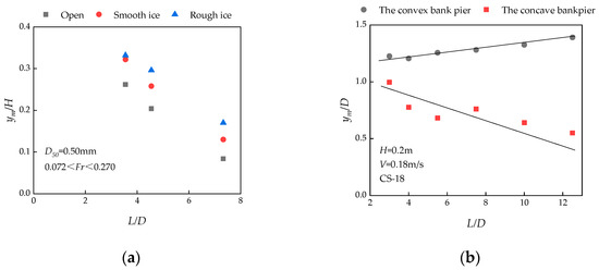 Namaee and Sui [25] investigated the relationship between the ym/H and the relative pier spacing (L/D) of side-by-side double piers in an ice-covered straight flume. It can be observed from Figure 10a that the ym/H decreased as the L/D increased. It is worth noting that the results in the bend channel were different from those acquired in the straight channel when the side-by-side double piers were placed at the bend apex cross-section of the S-shaped flume. Figure 10b shows the relationship between the maximum relative local scour depth and the pier spacing at CS-18. It can be seen from Figure 10b that the relative local scour depth is greater around the convex bank pier than that around the concave bank pier under the same experimental setups. Different from the mechanism of local scour at piers in a straight channel, the relative scour depth around the convex bank pier in the S-shaped flume increases as the pier spacing increases, but it decreases around the concave bank pier as the pier spacing increases. As can be seen from Figure 11, the depth of scour holes around the convex bank pier increases with increases in the L/D at the bend apex section because the velocity gradient in front of the pier increases, which subsequently increases the shear force of the flow, leading to more accessible transportation of the sediments by water. In contrast, the depth of scour holes around the concave bank pier decreases as the L/D increases because the velocity gradient decreases, leading to a weak horseshoe vortex strength in front of the piers.