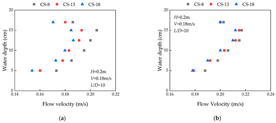 A comparison was conducted regarding the variations in scour depth when side-by-side double piers were placed at different bend apex cross-sections of the S-shaped flume. As illustrated in Figure 12, the relative local scour depths around the convex bank pier are much greater than those around the concave bank pier when the experiment setup is the same. Additionally, the relative scour depth shows an increasing trend with increases in the L/D at the convex bank and a decreasing trend with increases in the L/D at the concave bank. As shown in Figure 12, the further toward the downstream (namely, as the bends increase toward downstream), the shallower the scour hole around the concave bank pier. In contrast, the local scour depths around the convex bank pier remain virtually constant at different bend apex cross-sections. The quasi-constant scour depths around the convex bank pier are caused by energy dissipation due to the friction as the water travels downstream of the S-shaped flume. The flow velocity in front of the concave bank pier gradually decreases as the flow approaches further downstream (namely, the bend increases toward downstream), as illustrated in Figure 13a. As a result, the flow’s shear force decreases, the scouring process becomes weak, and the equilibrium scour depth decreases. The velocity distribution in front of the convex bank pier at different bend apex cross-sections is nearly identical, as depicted in Figure 13b, despite some losses in flow kinetic energy. The velocity distributions in front of the convex bank pier at different cross-sections are congruent in all cases. Therefore, the local scour depths around the convex bank pier at different bend apex cross-sections are also congruous.
