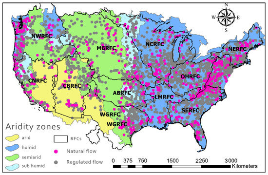 In this study, the Geospatial Attributes of Gages for Evaluating Streamflow, Version II (GAGES-2) database, maintained by the United States Geological Survey (USGS), was utilized to obtain stream gage locations. The GAGES-2 dataset comprises daily streamflow data for over 9000 stream gages located throughout the United States and its territories, as well as metadata describing the stream gages and the data, including both natural flow and regulated flow sites. Notably, the GAGES-2 dataset was employed solely for the purpose of identifying watersheds, which have natural flow conditions. In the GAGES-2 dataset, stream gages, which at some point in their history had periods which represented natural flow, are identified as USGS hydro-Climatic Data Network (HCDN) [34]. It should be noted that the original composition of the HCDN dataset incorporated a total of 743 distinct sites. The flow type (natural or regulated) was further investigated through the NHDPlus version 2.1 dataset [35]. Subsequently, streamflow data were obtained from the USGS National Water Information System (NWIS) portal [36].