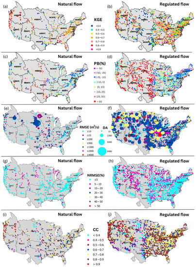 Spatial variation of evaluation metrics results for the NWM hourly streamflow series against observed natural and regulated streamflow series. PB, RMSE, NRMSE, and CC results for natural flow sites are presented in subfigures (a,c,e,g,i), respectively. PB, RMSE, NRMSE, and CC results for regulated flow are presented in subfigures (b,d,f,h,j), respectively.