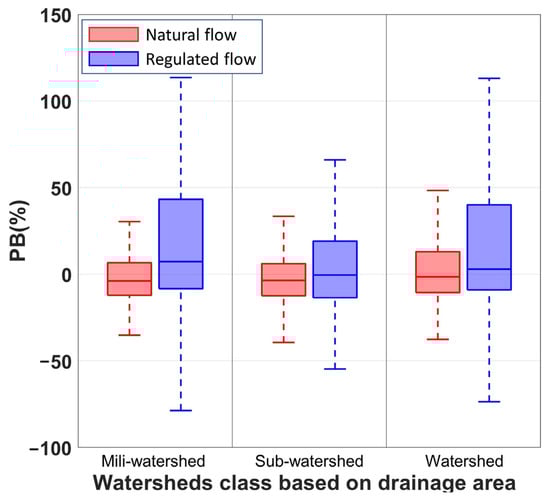 Boxplot showing PB variation as a function drainage area for natural and regulated flow. Boxes indicate the interquartile range (IQR) of the data. Within each box, horizontal lines indicate the median PB value; the first (Q1) and third (Q3) quantiles are marked by boxes, and whiskers extend to 1.5 interquartile ranges.