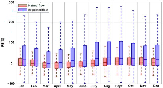 Boxplot showing monthly PB variation for natural flow and regulated flow hourly data.