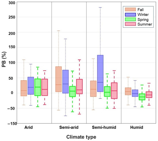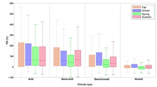 Figure 6 illustrates the spatiotemporal variation in the accuracy of the NWM natural flow estimates in terms of PB. In arid regions, the results revealed that the model generally overestimates streamflow values across all seasons, with median PB values of 7.85%, 18.80%, 19.54%, and 11.89% for fall, winter, spring, and summer estimates, respectively. These findings imply that the model exhibits enhanced performance during the summer and fall seasons in arid regions, while the performance deteriorates during the winter and spring seasons.