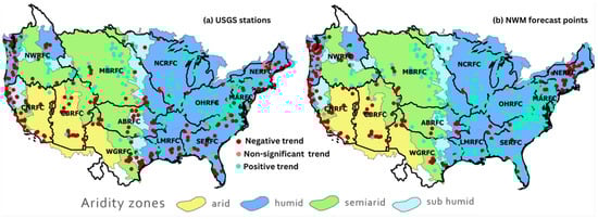 For other RFCs where streamflow values were overestimated, such as the MBRFC, ABRFC, and WGRFC, trend results obtained from the NWM series demonstrated a dominant increasing trend in those regions. However, in-situ measurement results revealed a prevailing decreasing trend in the ABRFC and WGRFC. The obtained results could be elucidated by the positive PB and low correlation for forecast points located in these regions (Figure 2c,i). Overall, the MMK test results disclosed a satisfactory agreement between the temporal evolution of the observed and simulated natural streamflow series for 74% of the studied dataset.