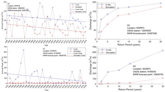 Annual peak series and flood return period series (up to 30 years) for selected stations from the NWRFC and WGRFC. Annual peak series (a,c) were used to estimate the 1, 2, 5, 10, 15, and 30-year return period discharge values, marked as dots in (b,d).