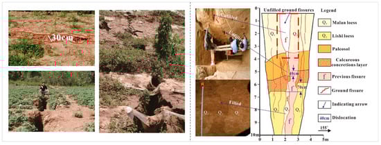 Water is typically perceived as an adverse element in geological issues [,], as it frequently triggers geological disasters and engineering problems. Ground fissure is a type of geological hazard that occurs when the surface soil and rock ruptures [,,]. Understanding the underlying mechanisms of the formation has been a longstanding and complex study topic. Among the various mechanisms involved, relatively less attention has been paid to fissure formation induced by water erosion. Compared with other types of ground fissures, those caused by water erosion tend to be more sudden and can result in severe damage to infrastructure and farmland [,].