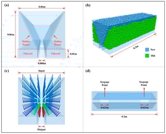 To better model the loose state of the soil inside the fissure, many particles were formed above the fissure and allowed to settle into it under gravity. The excess particles above the surface were then removed to create a representative sample. As the underlying paleosol was treated as a good water barrier, its thickness was set to 0.01 m. The fluid outlet was located at the position of the bottom fissure and two seepage points were established. The critical hydraulic gradient state of model was determined through extensive simulations to induce water erosion.