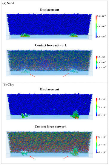 The ending stage of hidden holes: (a) the displacement distribution and contact force network of sand; (b) the displacement distribution and contact force network of clay.