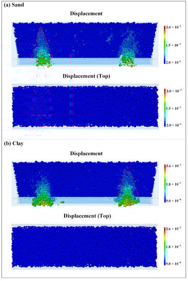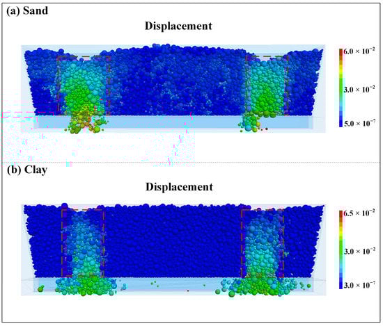 Figure 7 shows the displacement process and contact network that occur in the initial stage for sand and clay. The displacement distribution indicates that fine particles in sand and a few coarse particles begin to drop locally near the seepage point, while the contact network shows the disappearance of contact between the dropped particles and the body, indicating the occurrence of incipient erosion at the bottom and the formation of small hidden holes (Figure 7a). In clay, the coarse and fine particles cluster into small blocks and drop locally near the seepage point, forming small hidden holes, and the contact network shows the disappearance of contact between the dropped block and the body, but contact forces still exist between the particles within the block (Figure 7b). Unlike sand particles, which fall off individually, the presence of cohesive forces in clay increases the interparticle connectivity, leading to the blocky detachment of particles as the main cause. The contact network also reveals that the interaction forces between clay particles are much greater than those between sand particles. Figure 8 displays the development of the hidden hole after a modeled period of time. In comparison to Figure 7, the hidden holes have obviously expanded and show a tendency to develop upward. In sand, particle detachment remains mostly single particles, whereas in clay, the detached chunks become larger. Due to the formation of hidden holes, interparticle forces increase, stabilizing the main body.