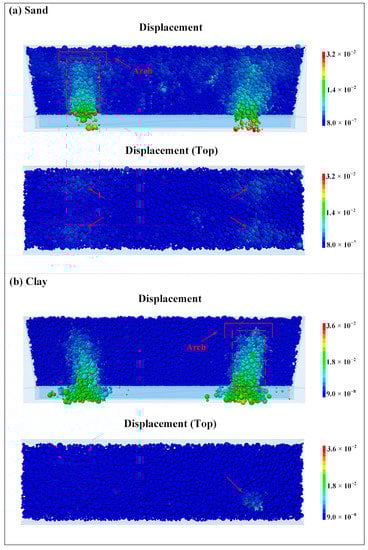 The beginning stage of an arch: (a) the lateral and top displacement distribution of sand; (b) the lateral and top displacement distribution of clay.