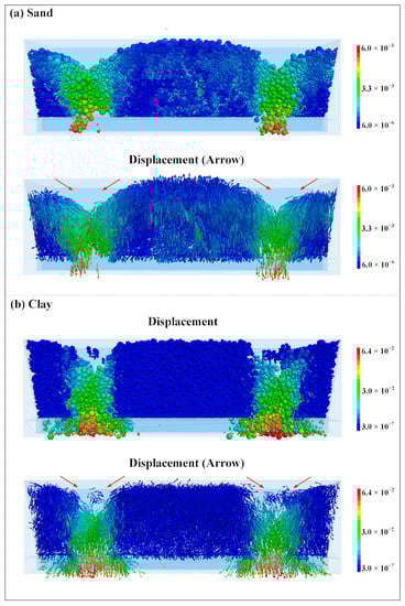 The ending stage of horizontal extension: (a) the displacement distribution of sand; (b) the displacement distribution of clay.