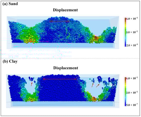 Figure 12 shows the displacement direction of the particles. As the depth of the collapsed hole increases, the soil on both sides of the hole will collapse inward, causing the collapsed hole to expand horizontally. Figure 13 shows the longitudinal development of a collapsed hole on one side to the bottom. Regardless of whether it is sand or clay, the final distribution is similar to a W-shape. The length of the bottom of the depression is basically the same as that of the seepage point, indicating that the shape of the seepage point at the bottom has a significant impact on the macroscopic manifestation of the exposed surface of the hidden fissure. In addition, during the process of particle collapse, a large number of soil particles move downward and accumulate at the bottom, and may reform an effective structure to resist fluid erosion. Comparison of Figure 13a,b reveals that the central portion of the sand gradually collapses with the formation of two horizontal sinkholes, while the majority of the soil in the center of the clay remains stable, with a few particles adhering to the fissures. This is because the clay has tensile strength that makes its horizontal extension significantly slower than that of the sand, which can be obviously observed as an increase in the distance between the two sinkholes at the surface.