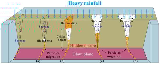 Figure 14 illustrates the complete process of reopening hidden fissures. In general, the emergence process can be divided into four stages following rainfall seepage: subsurface erosion into hidden holes, traction into arches, collapse into sinkholes, and horizontal extension, corresponding to stages (a–d) of Figure 14, respectively.