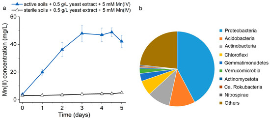 Mn(IV)-reducing activities (a) and structures (b) of microbial communities from Mn-contaminated soil amended with 0.5 g/L of yeast extract as electron donor under anaerobic conditions.