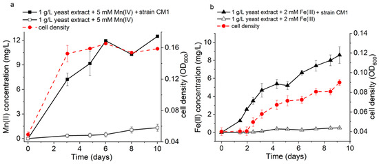 In a separate experiment, as depicted in Figure 4b, the concentration of dissolved Fe(II) under the influence of strain CM1 also showed a significant increase over time. The dissolved Fe(II) concentrations reached 4.9, 6.8 and 8.7 mg/L at the time points of 3.0, 6.0 and 9.0 days, respectively. This suggests that strain CM1 is equally efficient at reducing Fe(III) under anaerobic conditions. Like the Mn(IV) reduction, the process of Fe-oxide reduction was initiated concurrently with the growth of the CM1 strain, which reached the stationary phase of its growth cycle within 4.0 days in the presence of Fe oxides and a yeast extract. These findings establish that Cellulomonas sp. CM1 is capable of reducing not only Mn oxides but also Fe oxides when a yeast extract serves as the sole electron donor under anaerobic conditions.