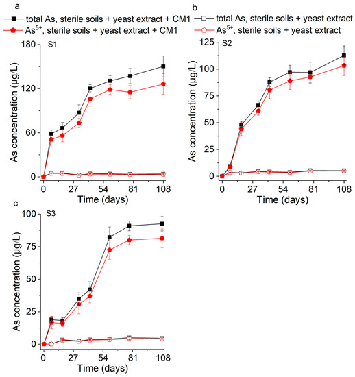 Arsenic mobilization and release mediated by Cellulomonas sp. CM1 from general vegetable field soils S1 (a), S2 (b) and S3 (c) under anaerobic conditions.