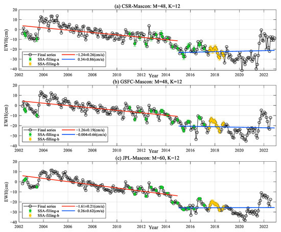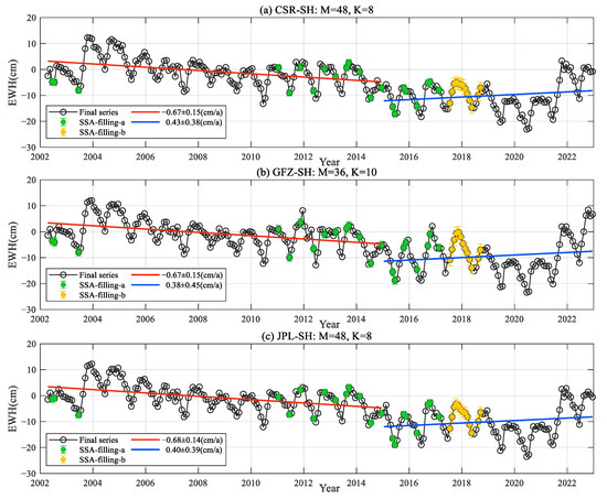 Using the multi-scale gain factor method to correct for leakage errors, we calculated the scale gain factor for each grid point in the North China Plain, multiplied the initial grid of SH products by the scale gain factor grid, and inverted it to obtain the equivalent water height change time series as the final estimate. Then, the time series of continuous changes in the equivalent water height of land water in the North China Plain were obtained after SSA interpolation. We fitted to obtain linear trends for 2002–2014 and 2015–2022, as shown in Figure 2 and Figure 3; M is the window width and K is the number of .