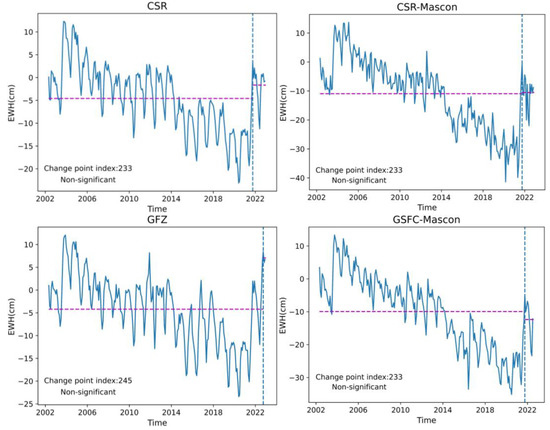 For the EWH variation time series obtained from the inversion of the above six products, the trend values were calculated using the Sen’s slope estimator and the Mann–Kendall trend test [26] was performed. The null hypothesis for the test was that there was no monotonic trend in the series, and the results are listed in Table 2. p is the confidence level, which is used to measure the probability that the null hypothesis holds, slope equals the Theil–Sen estimator/slope, z is normalized test statistics, and Tau is the Kendall Tau.