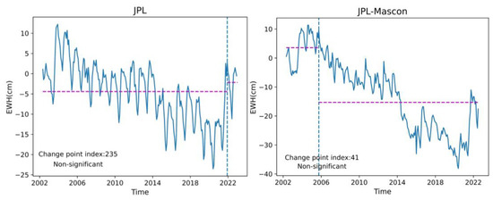 The results show that all change points were nonsignificant, concluding that the abrupt changes in terrestrial, soil, and groundwater storage in the North China Plain were insignificant.