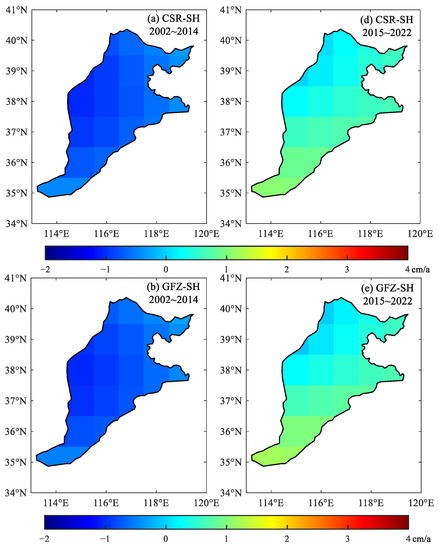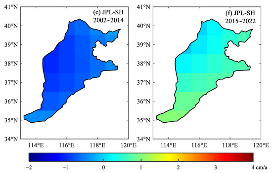 April 2002~December 2014, spatial–temporal distribution of TWS in the North China Plain based on (a) CSR-SH, (b) GFZ-SH, and (c) JPL-SH inversion; January 2015~December 2022, spatial–temporal distribution of TWS in the North China Plain based on (d) CSR-SH, (e) GFZ-SH, and (f) JPL-SH inversion.
