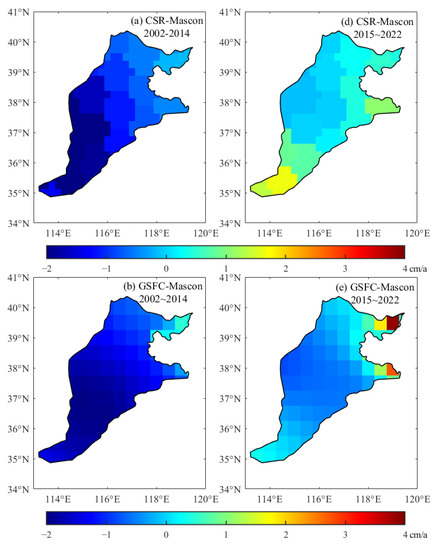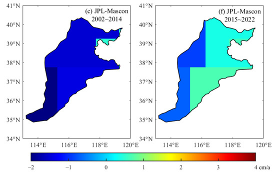 April 2002~December 2014, spatial–temporal distribution of TWS in the North China Plain based on (a) CSR-Mascon, (b) GSFC-Mascon, and (c) JPL-Mascon inversion; January 2015~December 2022, spatial–temporal distribution of TWS in the North China Plain based on (d) CSR-Mascon (e) GSFC-Mascon, and (f) JPL-Mascon inversion.