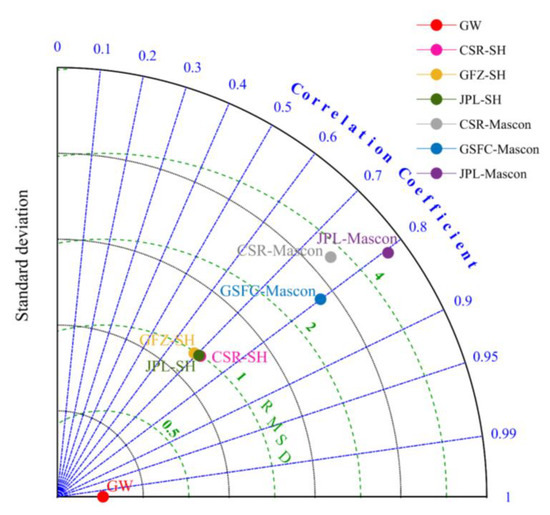 We select RMSE and NSE as quantitative indicators to assess the consistency between the changes in groundwater storage based on GRACE/GRACE-FO and the changes in water storage in measured wells, and select the measured well data as the reference series to draw the Taylor diagram [31] to compare the accuracy of different models, so as to compare and analyze the inversion effects of six types of GRACE/GRACE-FO products in the North China Plain. The consistency results are presented in Table 5 and Figure 7 shows the Taylor diagram for the different models.