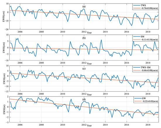 January 2005~December 2018, (a) Time series of TWS in the North China Plain based on CSR-SH inversion; (b) Fitting trend in time series of soil moisture storage changes; (c) Time series of groundwater reserves change obtained by TWS−SM; (d) Fitting trend in measured groundwater table change time series.