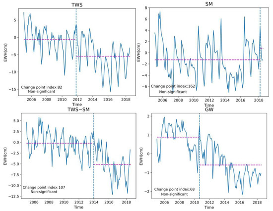 The p values for the TWS, SM, TWS-SM, and GW time series test results were all 0, less than the significance level (alpha = 0.05), indicating a significant trend in the TWS, SM, TWS-SM, and GW time series. The Pettitt test was used to determine points of change and the level of significance of the change points and results are shown in Figure 9.