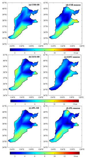 The most important feature of Mascon products compared to the traditional SH coefficients is that no smoothing filtering postprocessing is required. Traditional spherical harmonics require postprocessing such as low-order term replacement and supplementation, strip removal, GIA correction, etc. before they can be restored to their gridded EWH. While the Mascon products provide the gridded products directly, the postprocessing process, including GIA correction, is carried out before release and can be used directly. The SH coefficient products use the traditional kinetic integration method to establish interstellar observations as a function of SH coefficients during data processing, whereas the Mascon products directly establish Level 1B data as a function of the EWH of the grid, using a regularization method to deal with north–south strip noise. In addition, another feature of the Mascon products is that leakage errors are taken into account. Because of the spatial observations of the GRACE satellites and the removal of striping errors, the gravity signal recovered with GRACE can leak from the mass source region where it was generated to other regions, such as land signals to the ocean, seismic signals to the ocean, etc. The Mascon products, however, take into account and partially recover the leakage errors. For the SH coefficient products, a multi-scale factorization method was used to recover the leakage error. The multi-scale factor method, however, relies on the hydrological model used, and there is some uncertainty in using the hydrological model in the North China Plain. Therefore, this paper recognizes that the above is the main reason for the large discrepancy between the results of the Mascon products inversion and the SH coefficient products.