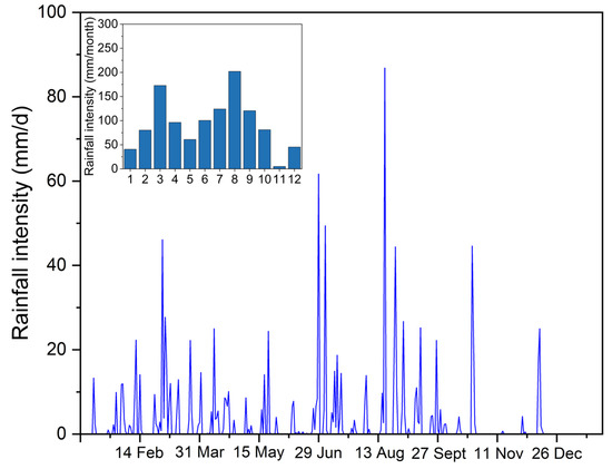 Compared with precipitation in the last decade, there was a clear distinction between the dry and wet seasons of that year; meanwhile, both the land use data and monthly water quality data of that year were collected by the authors, which is helpful to carry out the research of this paper’s topic. In order to reflect the seasonal variations of river water quality, according to the daily precipitation in Pudong New Area from January 2010 to December 2010, the entire monitoring period was divided into three periods: the dry season, the average season and the wet season. During the monitoring period, precipitation was higher in August and lower in January (Figure 2). Therefore, August was determined as the wet season, January was the dry season, and May was the average season.
