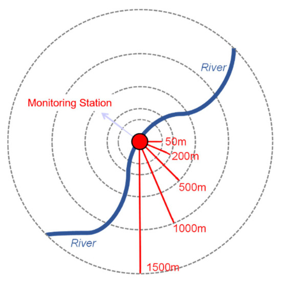 In order to determine the hydrologic unit of water quality monitoring stations, considering the features of the plain tidal area of Pudong New Area, the spatial scale is divided into: 50 m, 200 m, 500 m, 1000 m and 1500 m (Figure 3) [34,35]. Using the ArcGIS software, various radius buffers were considered taking the water quality monitoring stations as the center. After that, land use data of various buffers of each monitoring stations were acquired. Through the split operation in ArcGIS, the area of each land use in buffers was recalculated.