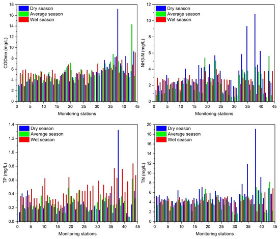 The water quality indicators varied in three hydrological seasons. The concentrations of CODMn and TN in the wet season are worse than those in the other two hydrological seasons, while that of NH3-N and TP in the average season is better (Figure 4). In general, the water quality is better in the average season but degraded in the wet season.