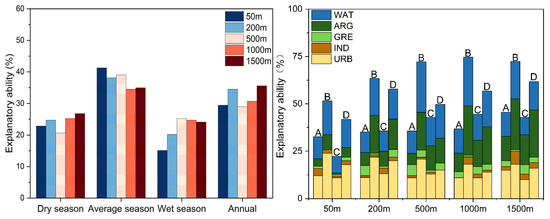 There are also obvious differences among different types of land in different hydrological seasons. In the dry season and the wet season, the explanatory ability of urban areas and water areas is the strongest, while that of other land uses is weak. In the average season, the explanatory ability of all land uses increased compared with the dry and wet seasons, and agricultural land had the most significant increase in explanatory ability to water quality. In the summary, urban areas, agricultural land and water areas have the strongest ability to explain water quality.