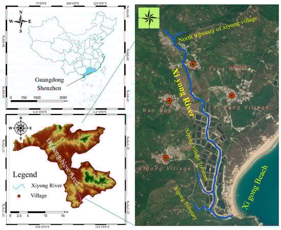 The Xiyong River studied in this paper is typically a small river. The river is in the Nan’ao Office of Dapeng New District, Shenzhen, with a watershed area of 9.5 km2. It originates from the Sheyinkeng (place name) at the southernmost end of the Nan’ao Office of Dapeng New District, and flows into Dapeng Bay from north to south at Xiyong Bay, at the end of the river. The average annual precipitation in many years in the basin is 2127 mm, the annual distribution of precipitation is very uneven, and the precipitation from April to October accounts for 90% of the annual precipitation.