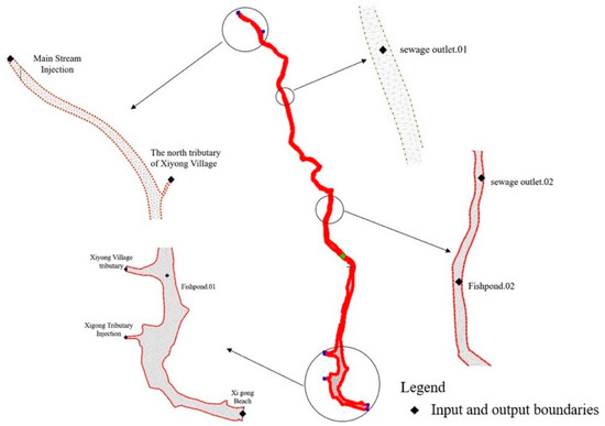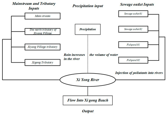 In order to understand the hydrodynamic relationship between the water body of the Xiyong River and the surrounding environment, a conceptual model of the river course was established, as shown in Figure 2. The model included the input and output items, simulating the flow and change process of the river water body. The input items included the upstream of the main stream, the north of Xiyong Village, Xiyong Village, and the tributaries of Xigong River as well as four sewage outlets. The village domestic sewage discharge points on both sides of the upstream of the river were simulated as two sewage outlets, and the sewage discharge simulation of fish ponds and farmland in the middle and downstream of the river was set as two sewage outlets. The output item was that the downstream of the main stream flows into Xiyong Beach. This conceptual model also included the effect of rainfall on the hydrodynamic state of the river.