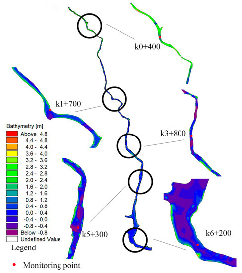 The boundary of the model used in calculation was determined by the UTM projection coordinate system algorithm in MIKE software, based on which we could see that the projection zone of Xiyong River is UTM49. Then, the Xiyong River was meshed with triangular meshes, and some narrow parts were refined. After more than 90 times of smoothing, the optimal meshed graph of the model was obtained (Figure 3). The mesh had 10,415 computing grids and 6421 computing nodes. The measured CAD geological exploration data were used to generate data boundaries and terrain data files, and the topographic difference graph was obtained. In order to better analyze the variation law of the concentration of each water quality index in the water quality simulation, the river basin was arranged with five interval monitoring points according to the actual distribution situation of villages, farmland, fish ponds, sewage outlets, and tributaries around the Xiyong River, which are marked as K0 + 400, K1 + 700, K3 + 800, K5 + 300, and K6 + 200, respectively. The distribution of monitoring points is shown in Figure 4.