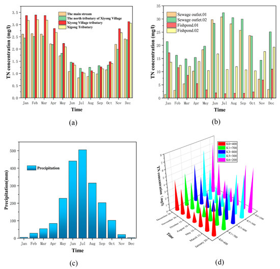 According to the year 2020 water quality monitoring report and the Revision of Shenzhen Sewage System Layout Plan (2011–2020), the annual average concentration of TN in the main stream is 1.78 mg/L, the annual average concentration of TN in the north tributary of Xiyong Village is 1.87 mg/L, and the annual average concentration of TN in the tributary of Xiyong Village is 2.34 mg/L. The annual average concentration of TN in the tributary of Xigong River is 2.17 mg/L, the annual average emission concentration of TN in the two sewage outlets is 16.96 mg/L and 22.79 mg/L, respectively, and the annual average emission concentration of TN in the two sewage outlets of the fishing ponds is 6.74 mg/L and 12.87 mg/L, respectively. We obtained from the Shenzhen Meteorological Bureau the monthly precipitation of Shenzhen in 2020. In seven months of 2020, specifically, in January, March, May, August, October, November, and December, we conducted water quality sampling and TN concentration laboratory testing at five monitoring points located along the river, respectively, and the test results were obtained. The above river information is shown in Figure 8.