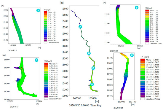 Figure 9 is the simulation results and local enlargement for August under Scenario 1. From the perspective of spatial distribution, and taking the simulation results in August as an example, the TN concentration values of five monitoring points at K0 + 400, K1 + 700, K3 + 800, K5 + 300, and K6 + 200, which are arranged from upstream to downstream, are listed in Table 2. The TN concentration distribution in the upstream of the river was relatively low, indicating that the ecological conditions in the upstream are relatively good. The TN concentration in the middle of the river was significantly increased, mainly because this part is located at the village gathering point, where sewage outlets are located and domestic sewage is discharged into the river without treatment. The TN concentration in the lower reaches of the river reached the highest for the following two reasons. On one hand, the purification capacity of the river itself is weak, and TN concentration from the upper and middle reaches diffuses to the lower reaches. On the other hand, fish ponds and farmland are distributed on both banks of the lower reaches of the river, which means that sewage, fertilizers, etc. are discharged into the river. In addition, the loss of local water and soil results in a rapid increase in the concentration of TN in the lower reaches and a serious deterioration in the water quality. From the perspective of time distribution, taking the simulation results of the downstream monitoring point K6 + 200 as an example, the simulated values of TN concentration in the 12 months of 2020 at this monitoring point are listed in Table 3. The concentration of TN in the river was large in the dry seasons of spring (February to April) and winter (November to January of the next year), while in the wet seasons of summer (May to July) and autumn (August to October), the concentration of TN in the river was low, which indicates that the river inflow has a great impact on the concentration distribution of TN in the river.