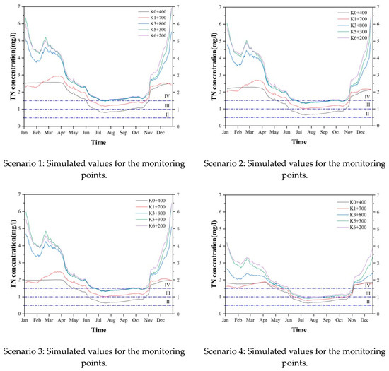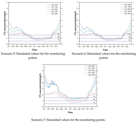 The simulation results of TN concentration at five monitoring points under different scenarios are shown in Figure 10. Taking the simulation results of Scenario 6 as an example, from the perspective of spatial distribution, the concentration of TN at the five monitoring points of K0 + 400, K1 + 700, K3 + 800, K5 + 300, and K6 + 200 gradually increased, and the concentration of TN at the downstream reached the maximum, but the increase in the TN concentration slowed significantly after the comprehensive treatment of pollutants. From the perspective of time distribution, the concentration of TN was relatively low from July to October, while it reached the maximum in January and December. After comprehensive treatment of the river channel, the concentration of TN in the river was still large in the dry season in winter and spring, and small in the wet season in summer and autumn, but the difference between the concentration of TN in the dry season and the wet season had been significantly reduced.